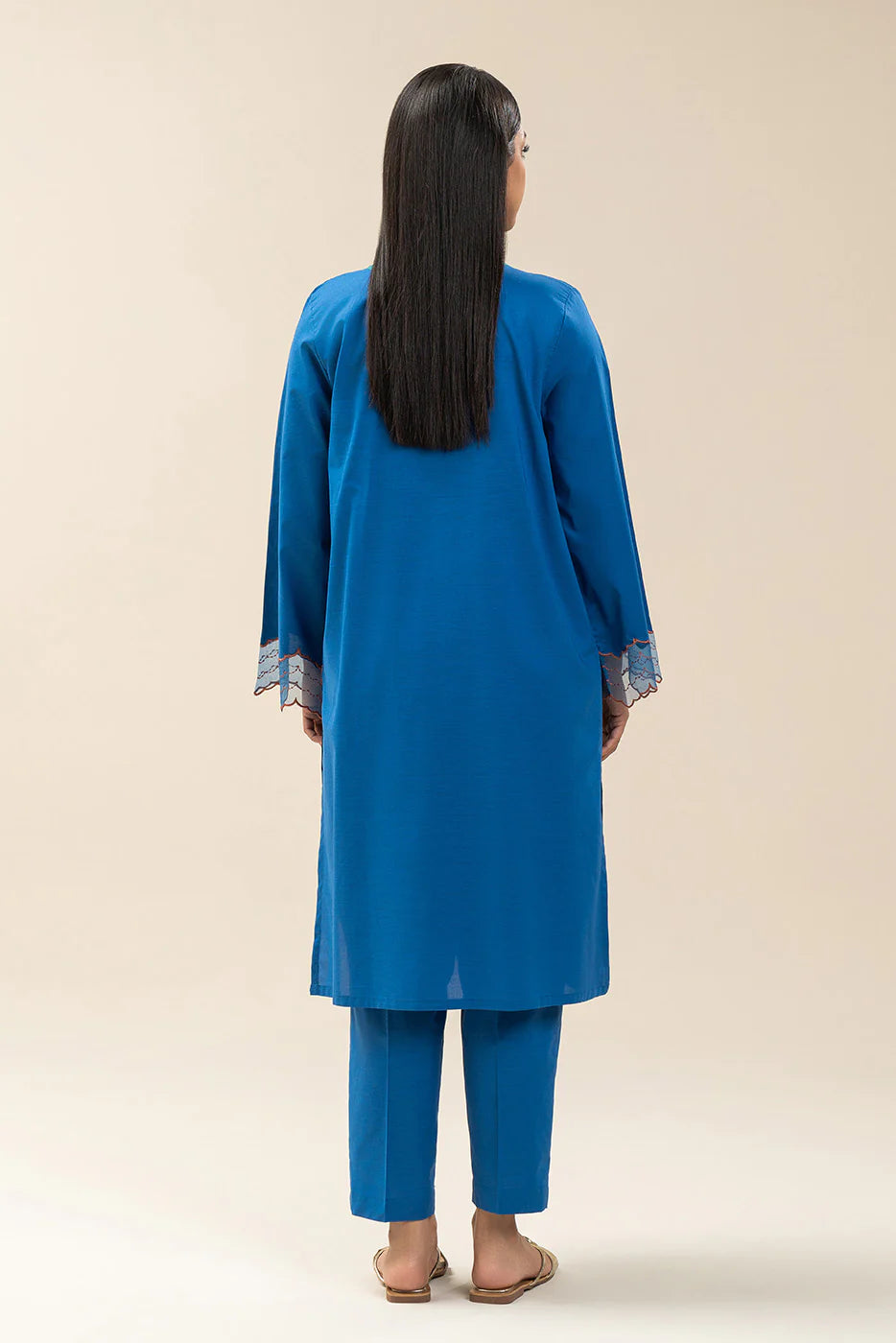 - Description: Band Collar Detail With Trim Insert. Long Printed Tunic Paired With Straight Pants